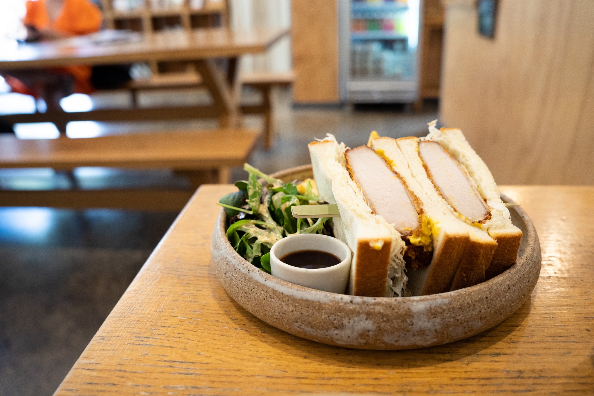 La Banette bread roll, grilled bacon, organic egg, greens, Kewpie mayo, Monaka tomato chutney